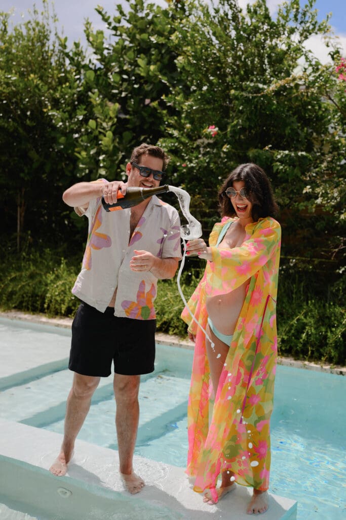 This session was shot on both digital and medium format film using my beloved Mamiya c220 (It also conveniently doubled as a prop!) — which gave us a range of tones and textures that matched the different moods we captured. From intimate, quiet moments to champagne-popping fun in the pool, the photos reflect who Luci and Alex are: lively, full of character, and deeply in love.